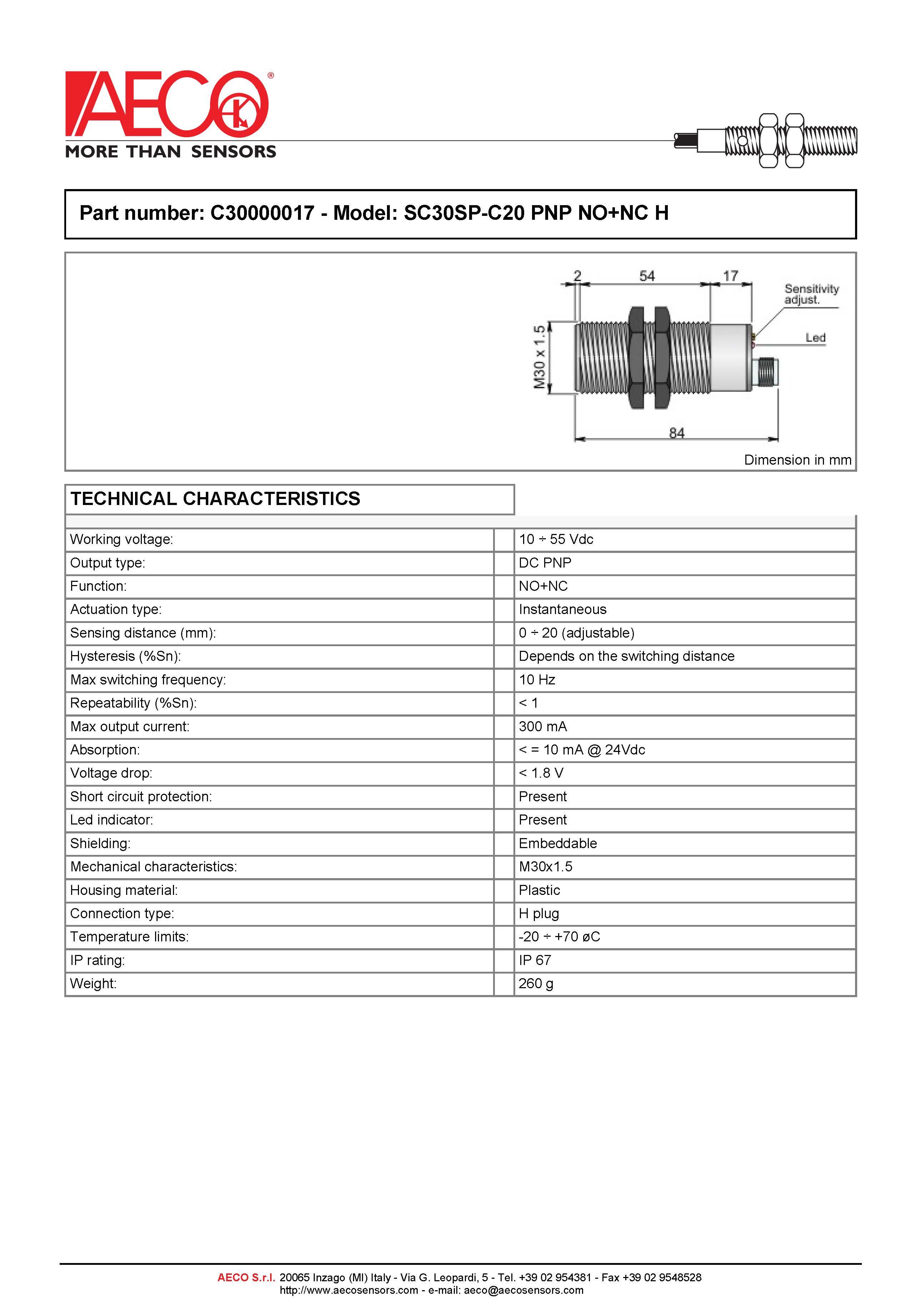 AECO CAPACITIVE SENSOR SC30SP-C20-PNP-NO+NC H
