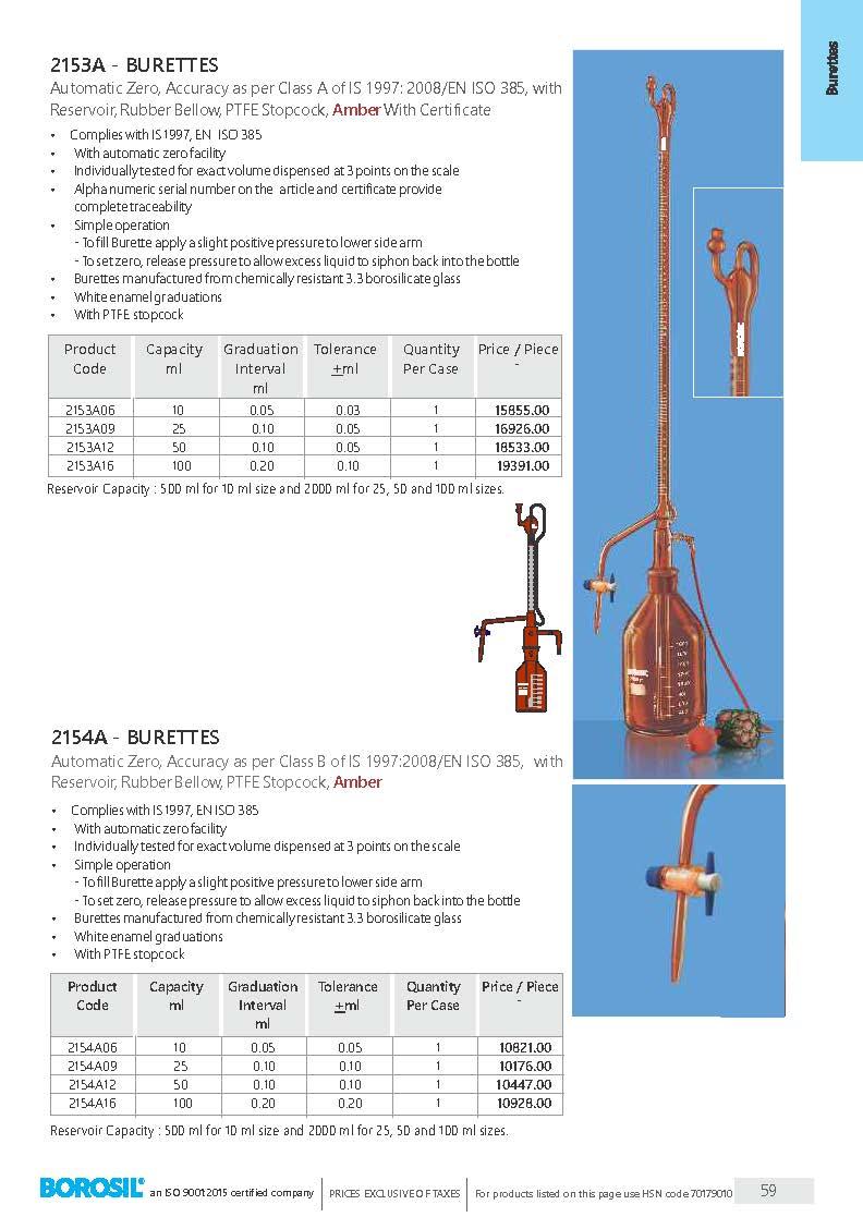 • Burettes manufactured from chemically resistant 3.3 borosilicate glass