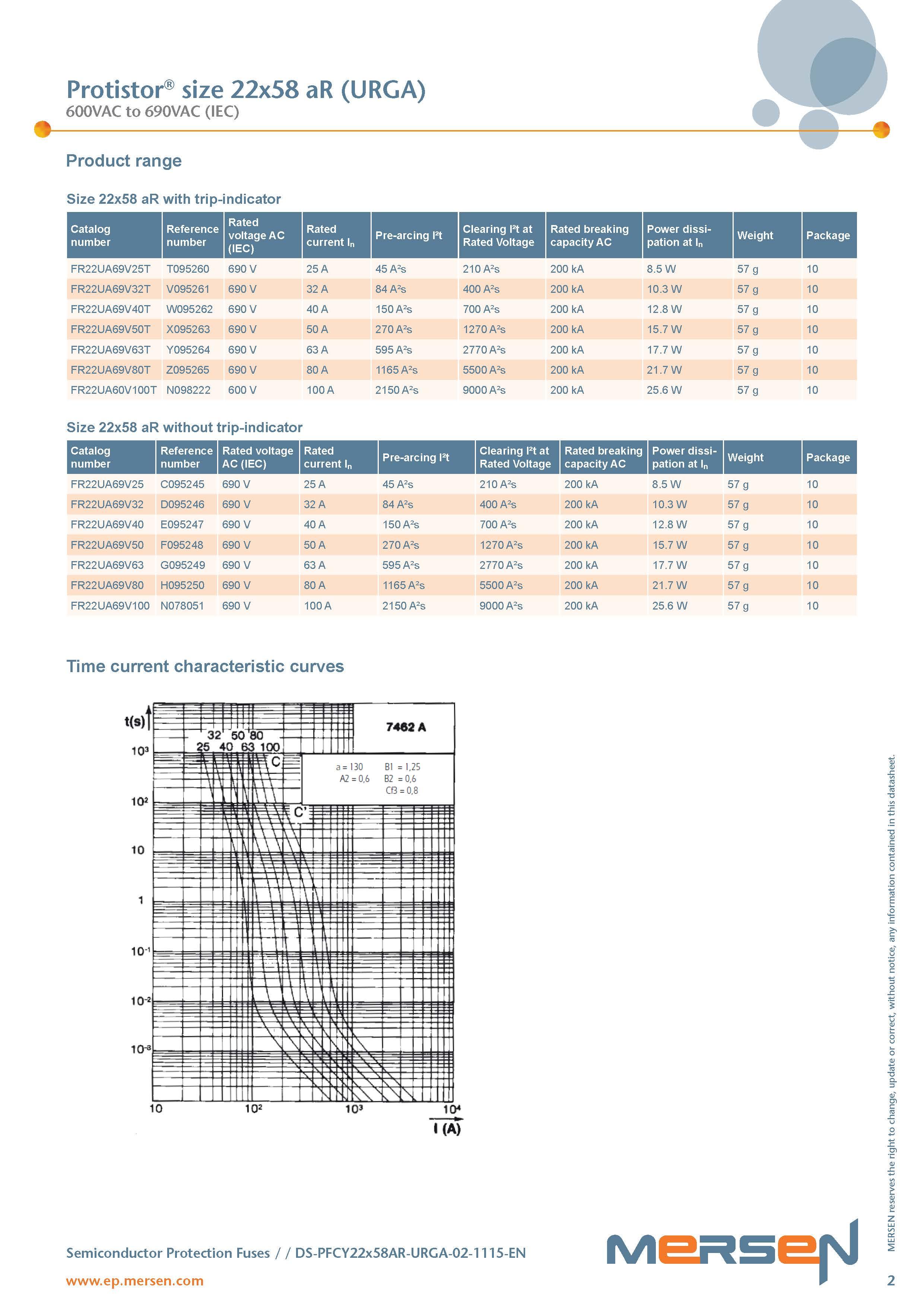 These Protistor® size 22x58 have been designed to protect power semi conductors, complying with standard IEC 60269-1 and -4. They are extremely high interrupting rating fuses: 600-690VAC, with large band of ratings (current rating 25 to 100A).