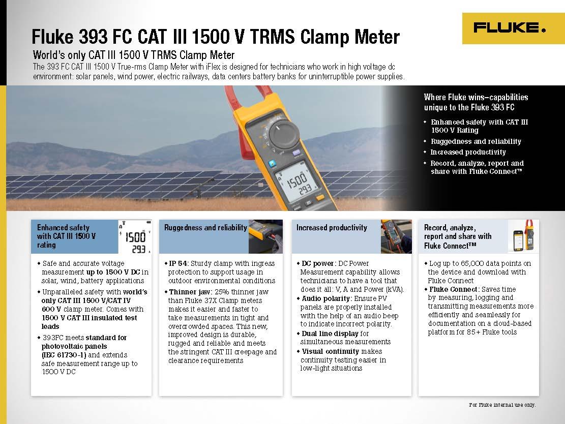 • 393FC meets standard for photovoltaic panels (IEC 61730-1) and extends safe measurement range up to 1500 V DC