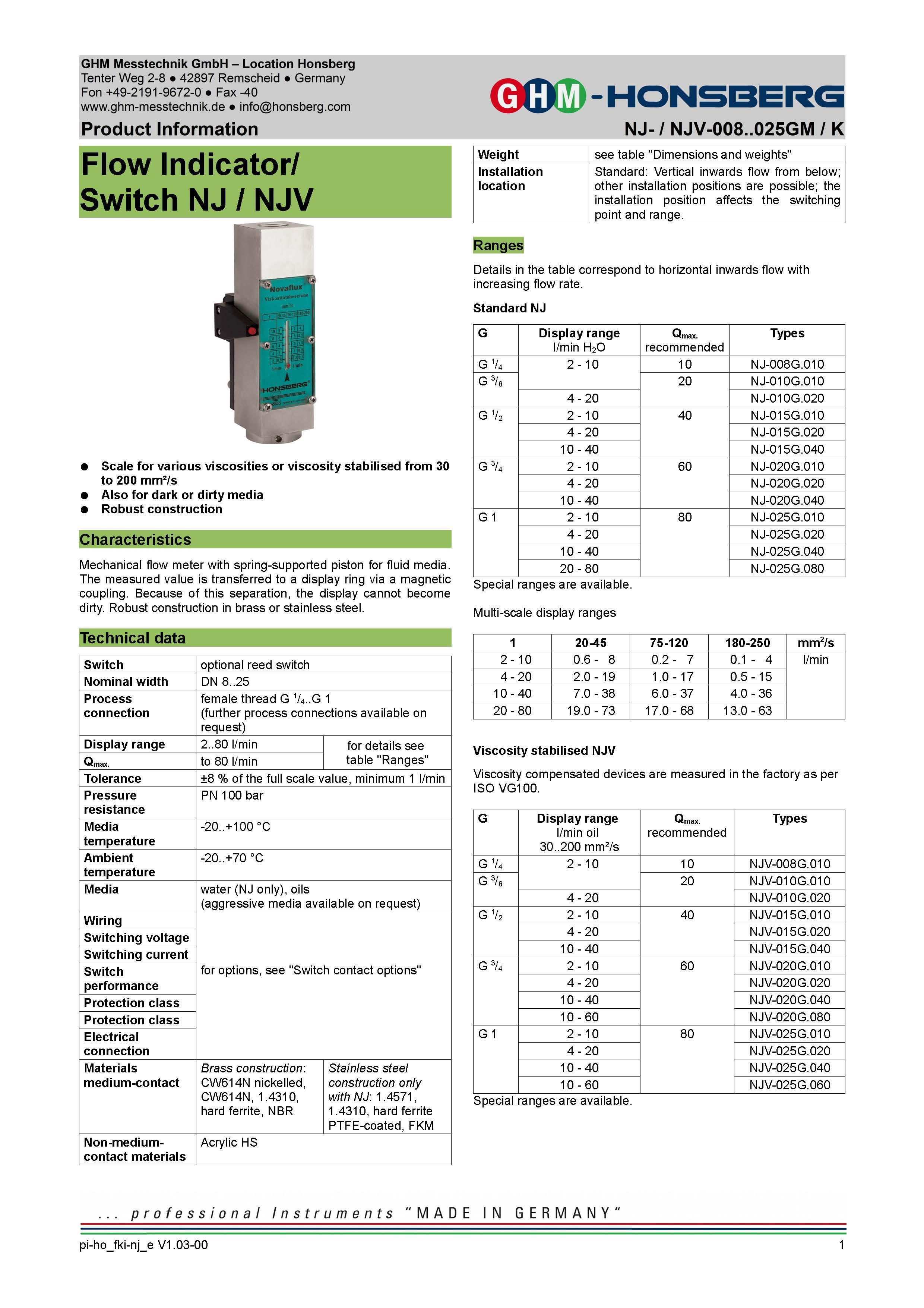 Mechanical flow meter with spring-supported piston for fluid media. The measured value is transferred to a display ring via a magnetic coupling. Because of this separation, the display cannot become dirty. Robust construction in brass or stainless steel.