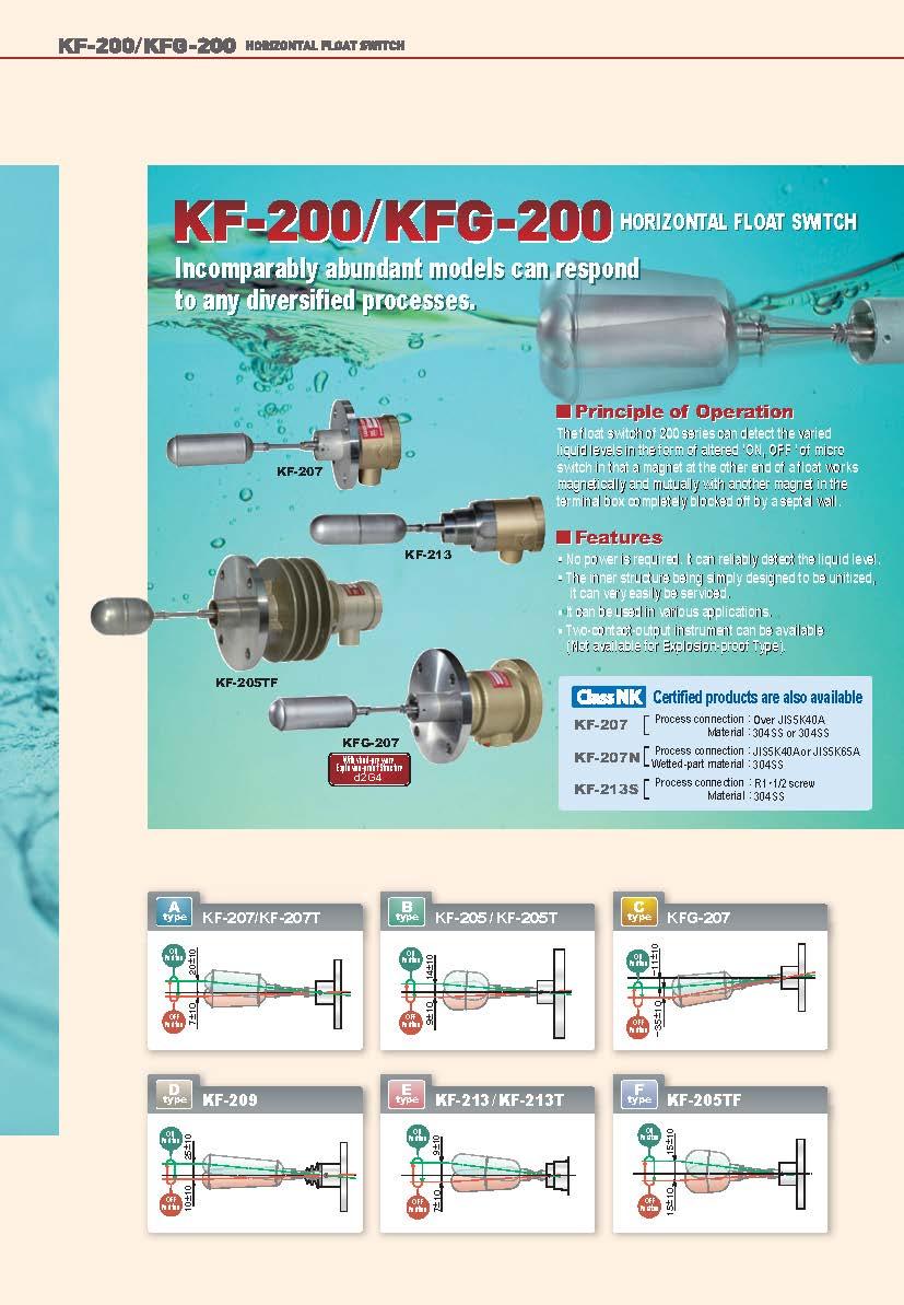 The float switch of 200 series can detect the varied liquid levels in the form of altered ‘ON, OFF ’ of micro switch in that a magnet at the other end of a float works magnetically and mutually with another magnet in the terminal box completely blocked off by a septal wall.