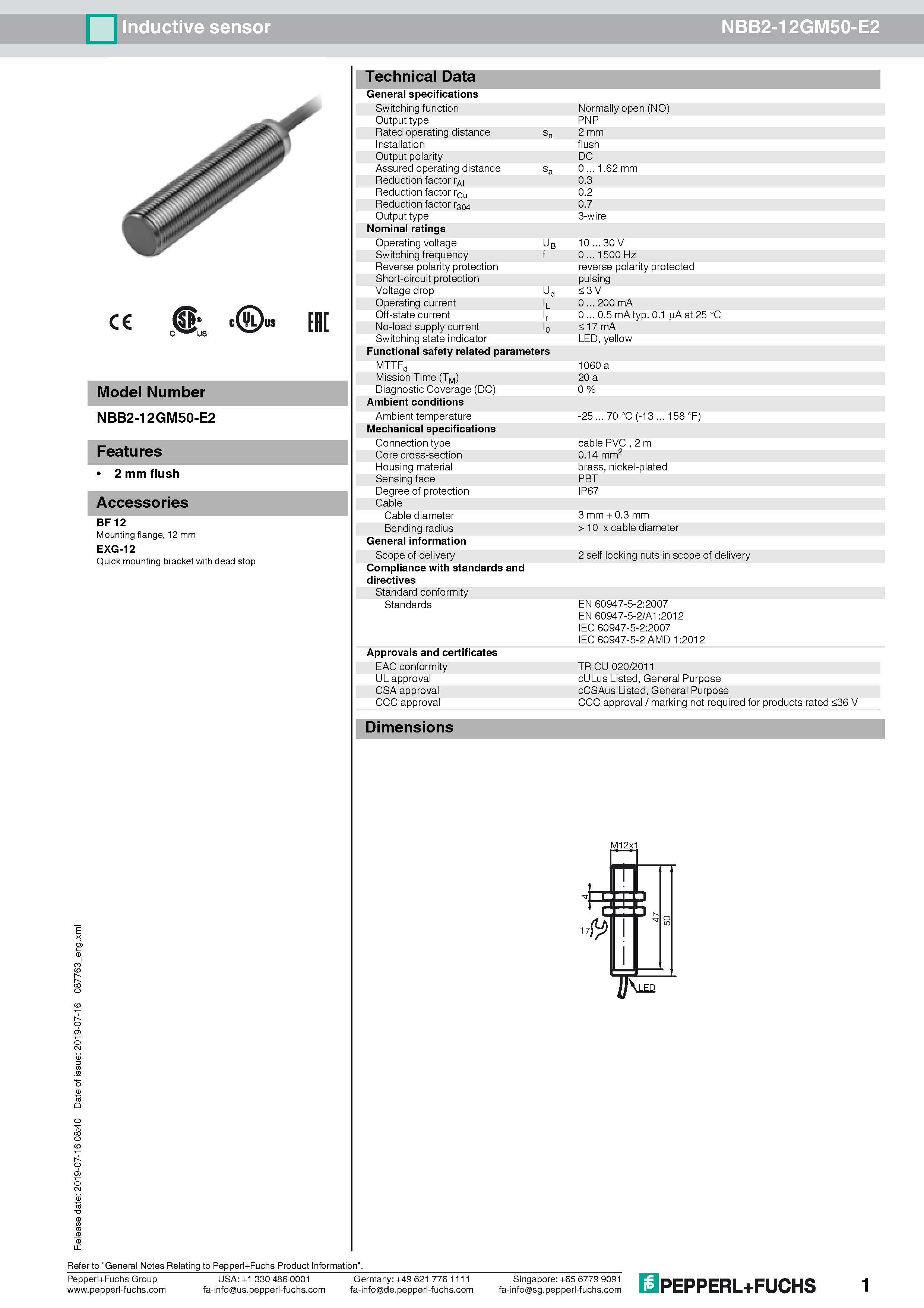 PEPPERL FUCHS INDUCTIVE SENSOR NBB2-12GM50-E2
