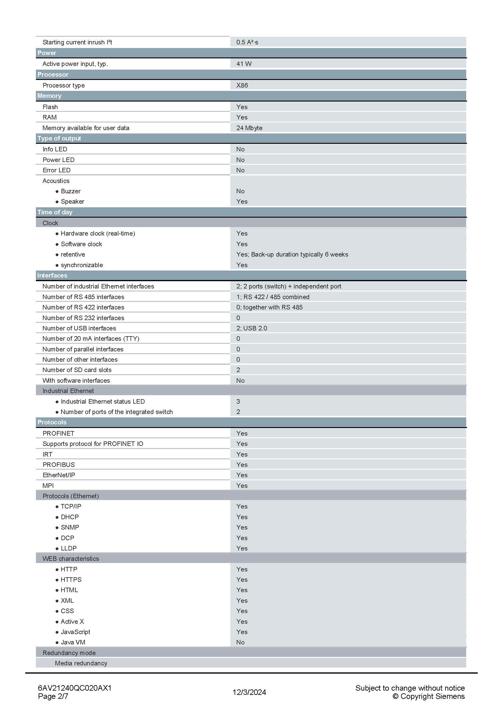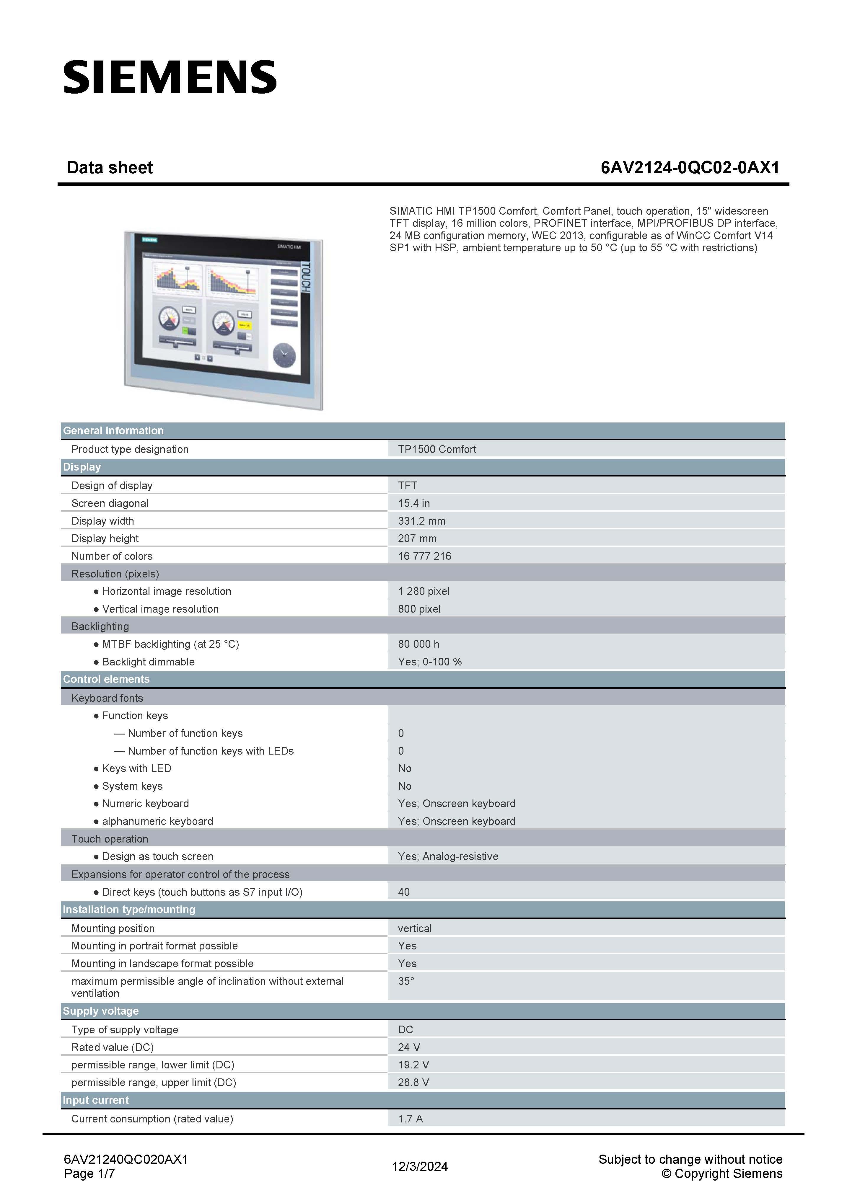 SIEMENS COMFORT PANEL 6AV2124-0QC02-0AX1