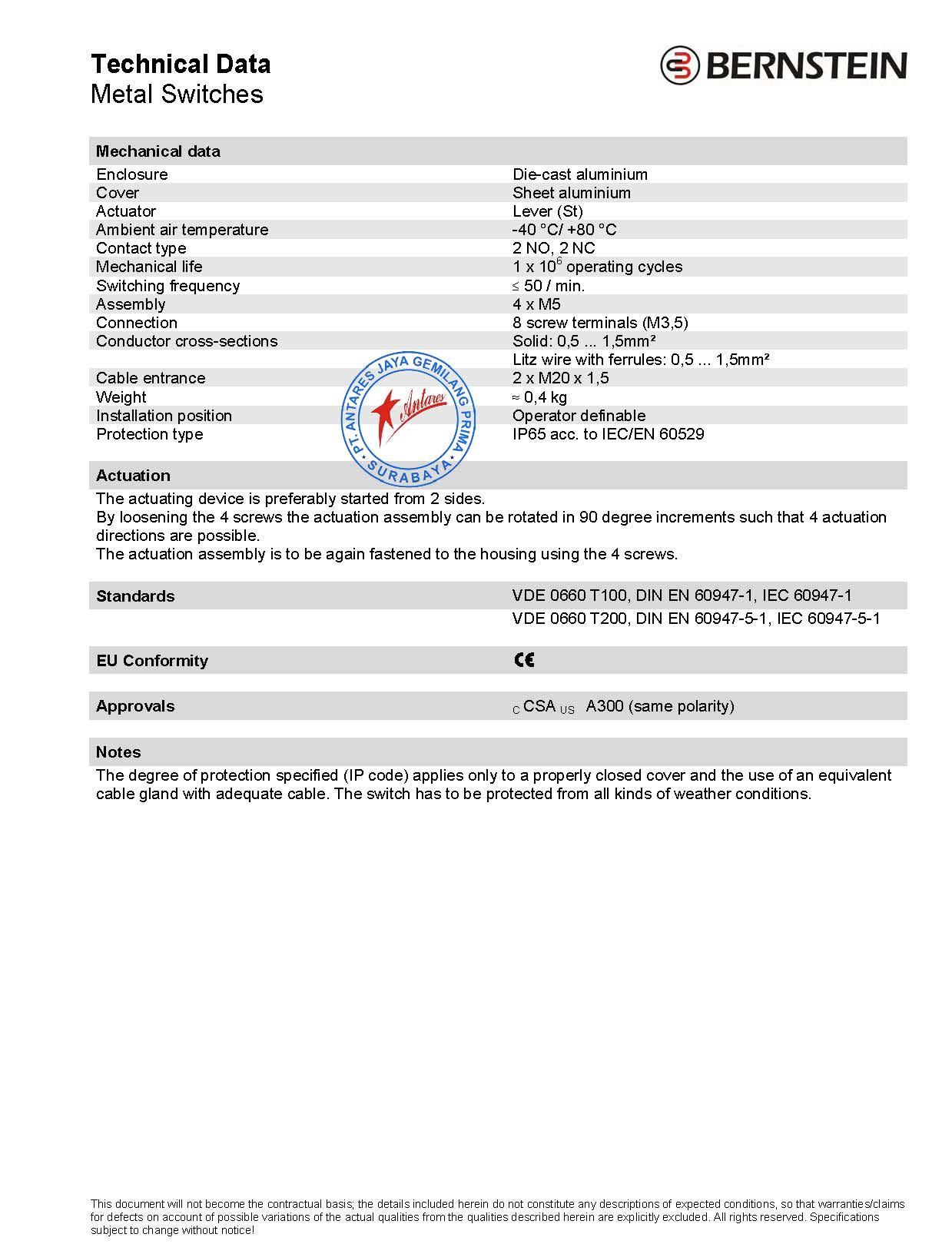 BERNSTEIN LIMIT SWITCH D-SU2 VKS 90 GR 614.2200.765