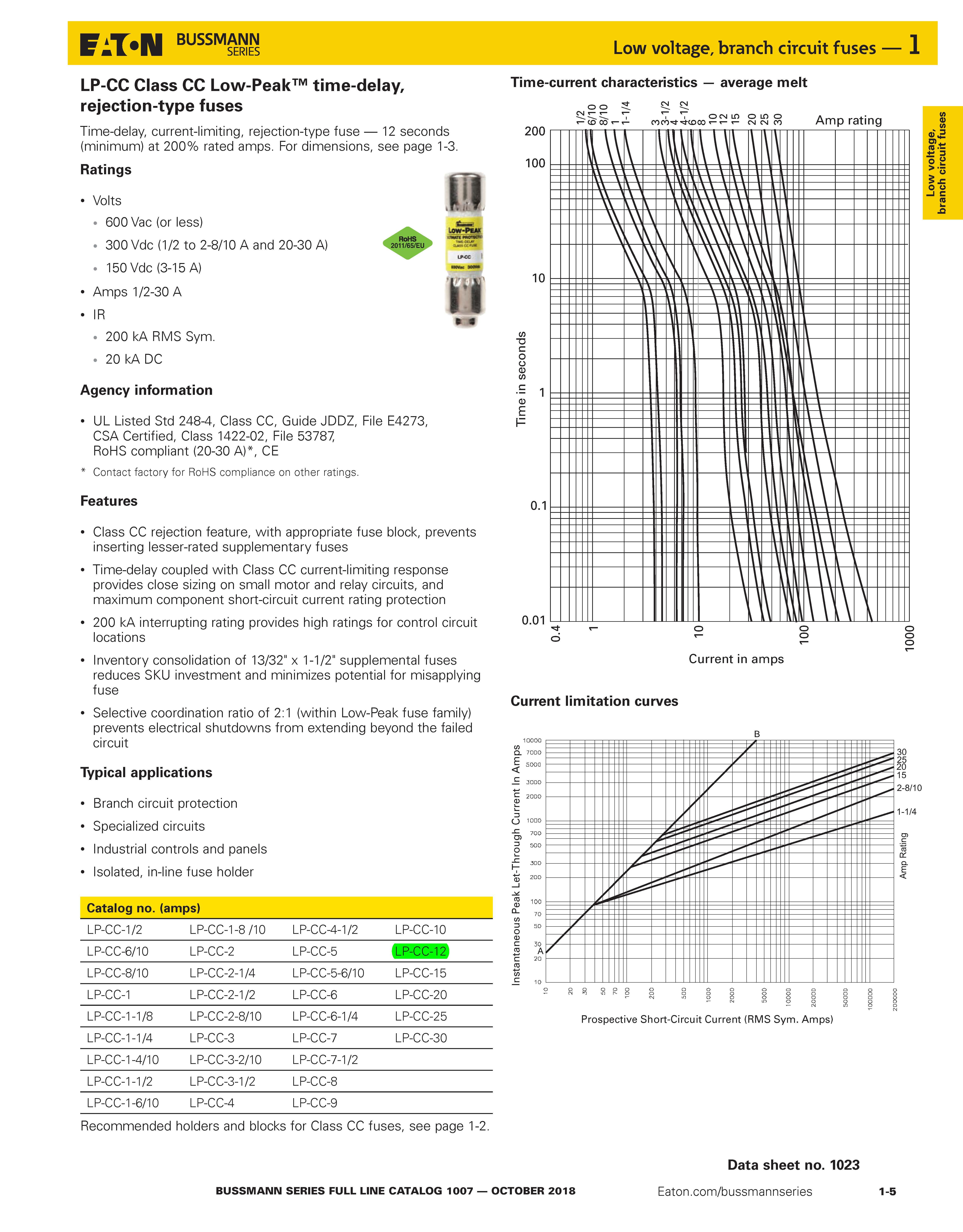 • Time-delay coupled with Class CC current-limiting response provides close sizing on small motor and relay circuits, and maximum component short-circuit current rating protection