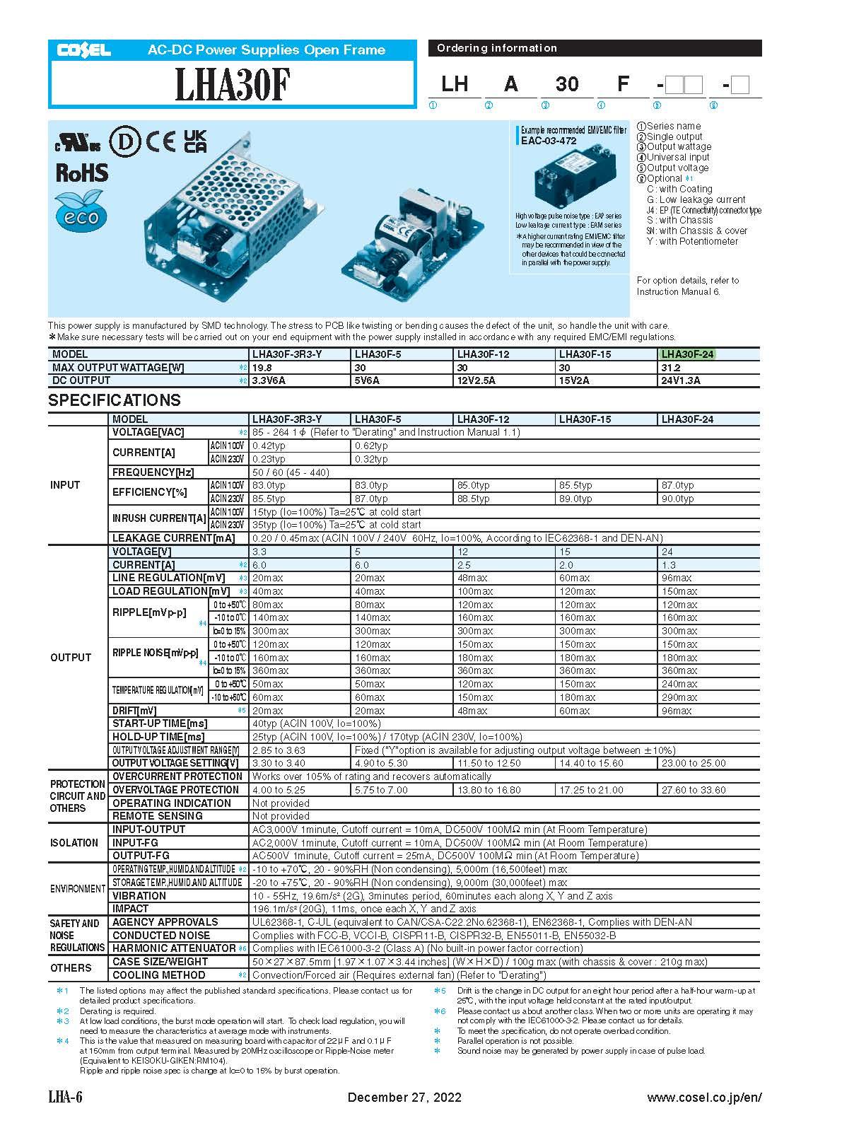 COSEL POWER SUPPLY LHA30F-24
