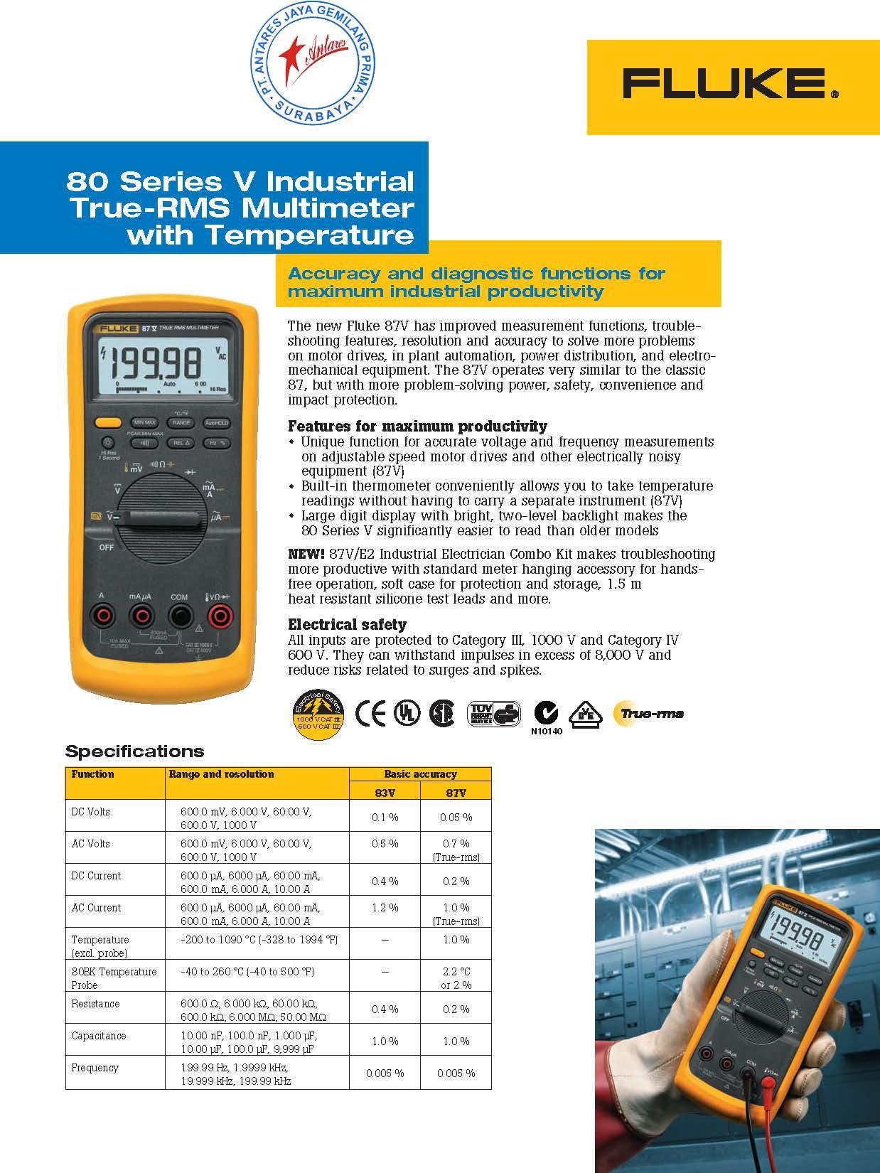• Built-in thermometer conveniently allows you to take temperature readings without having to carry a separate instrument (87V)
