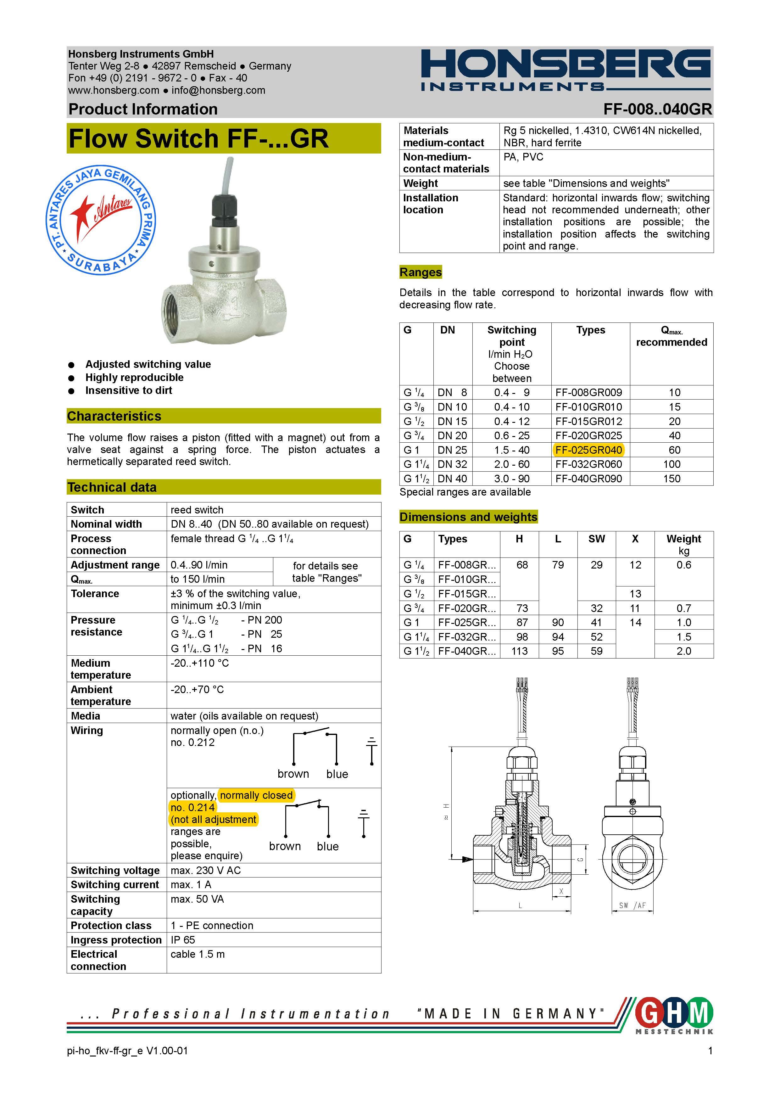 HONSBERG FLOW SWITCH FF-025GR040S-955067