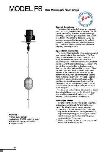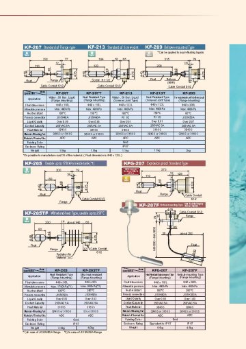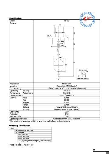 The float switch of 200 series can detect the varied liquid levels in the form of altered ‘ON, OFF ’ of micro switch in that a magnet at the other end of a float works magnetically and mutually with another magnet in the terminal box completely blocked off by a septal wall.