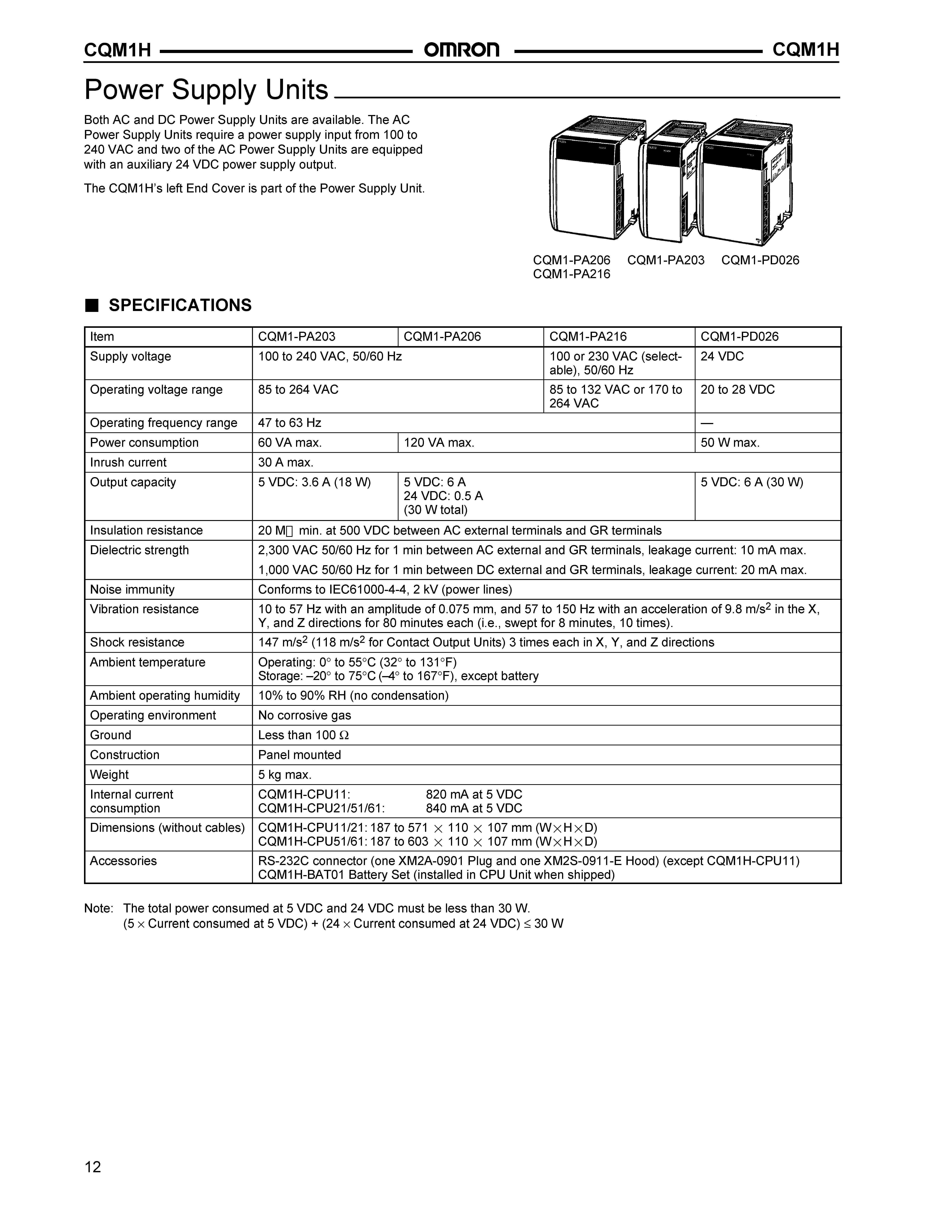 Both AC and DC Power Supply Units are available. The AC Power Supply Units require a power supply input from 100 to 240 VAC and two of the AC Power Supply Units are equipped with an auxiliary 24 VDC power supply output. The CQM1H’s left End Cover is part of the Power Supply Unit.