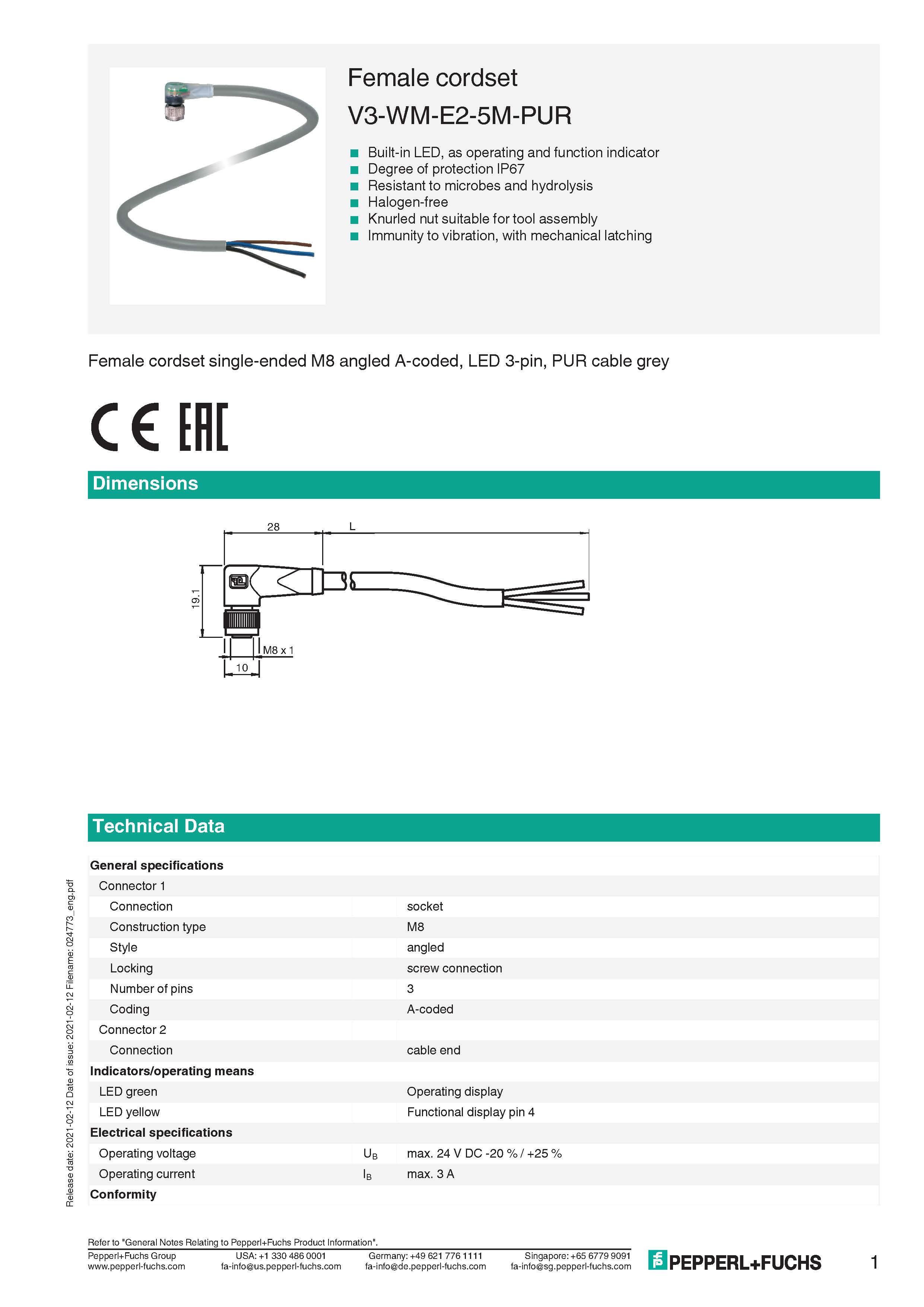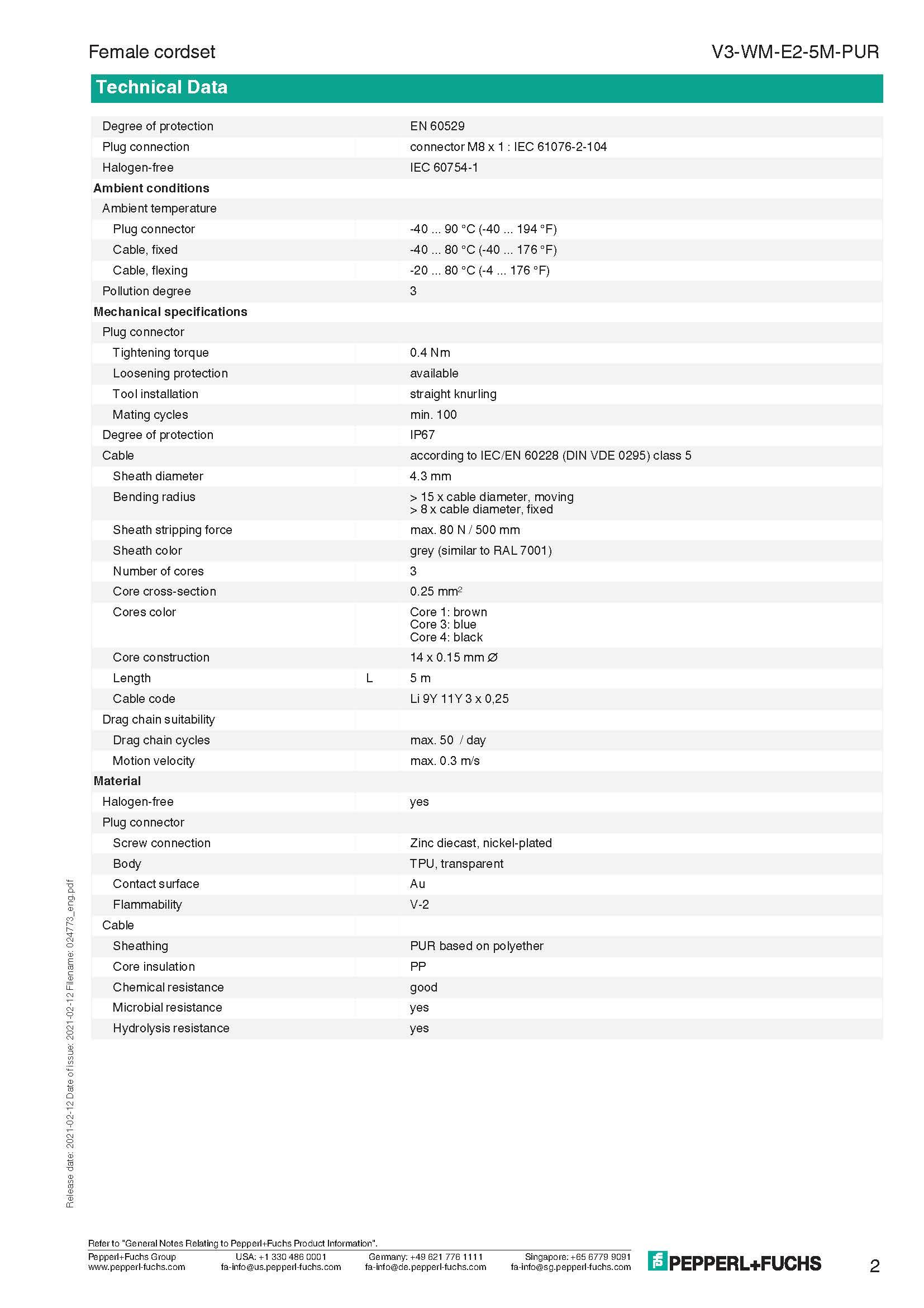 PEPPERL FUCHS FEMALE CORDSET V3-WM-E2-5M-PUR
