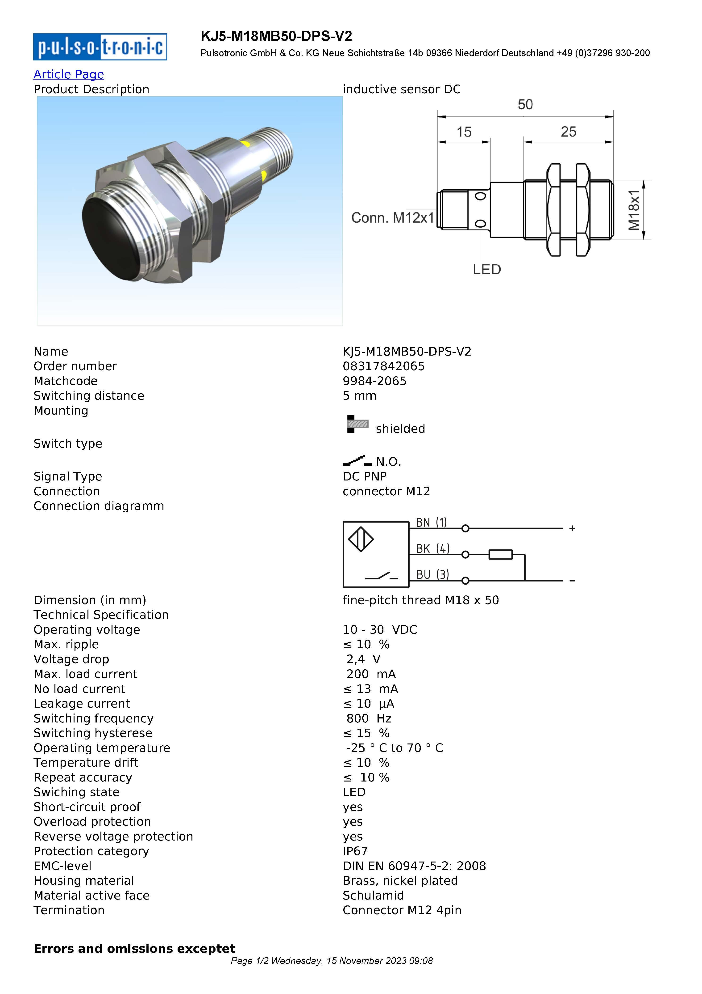 PULSOTRONIC PROXIMITY SWITCH KJ5-M18MB50-DPS-V2 ; 9984-2065