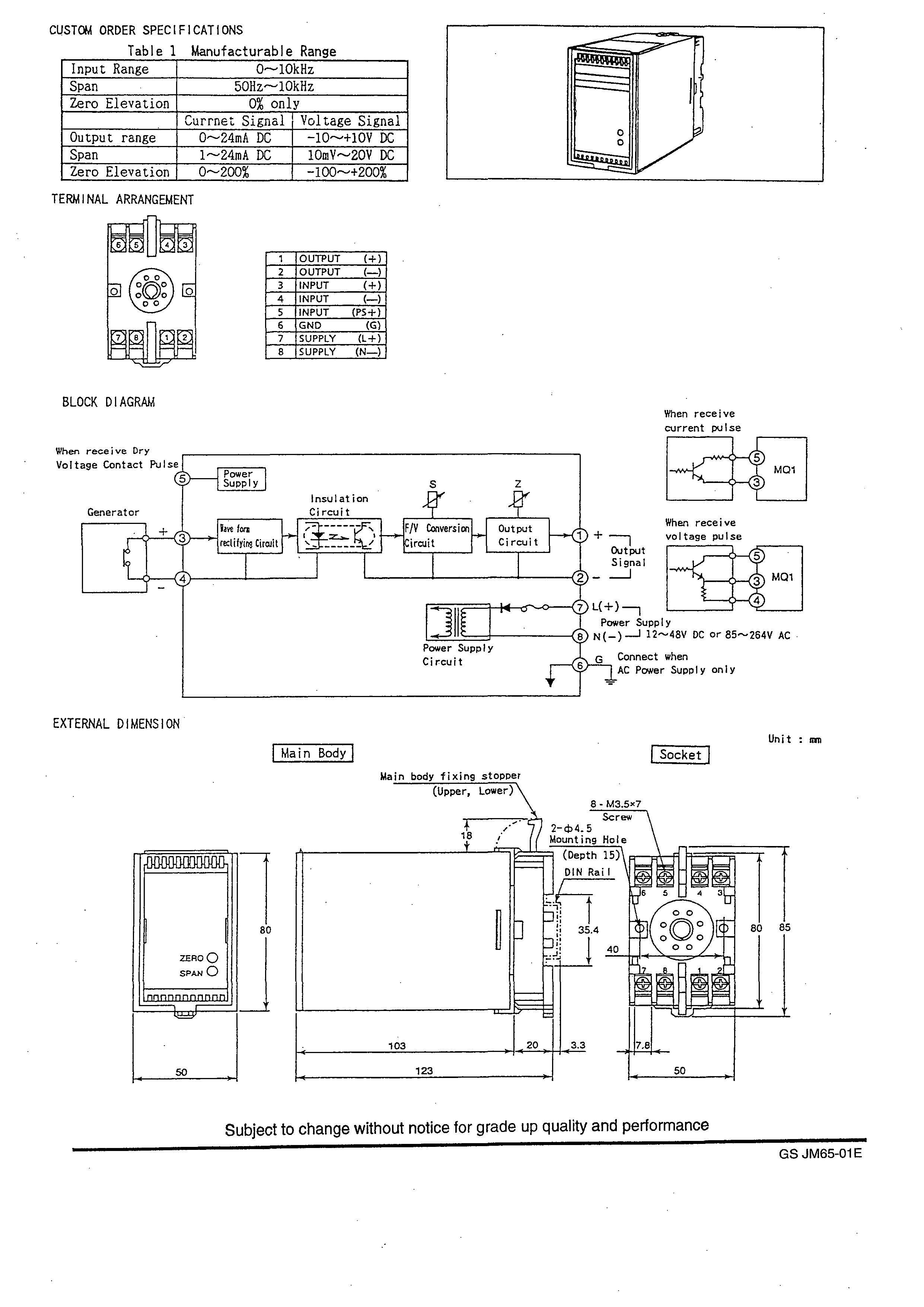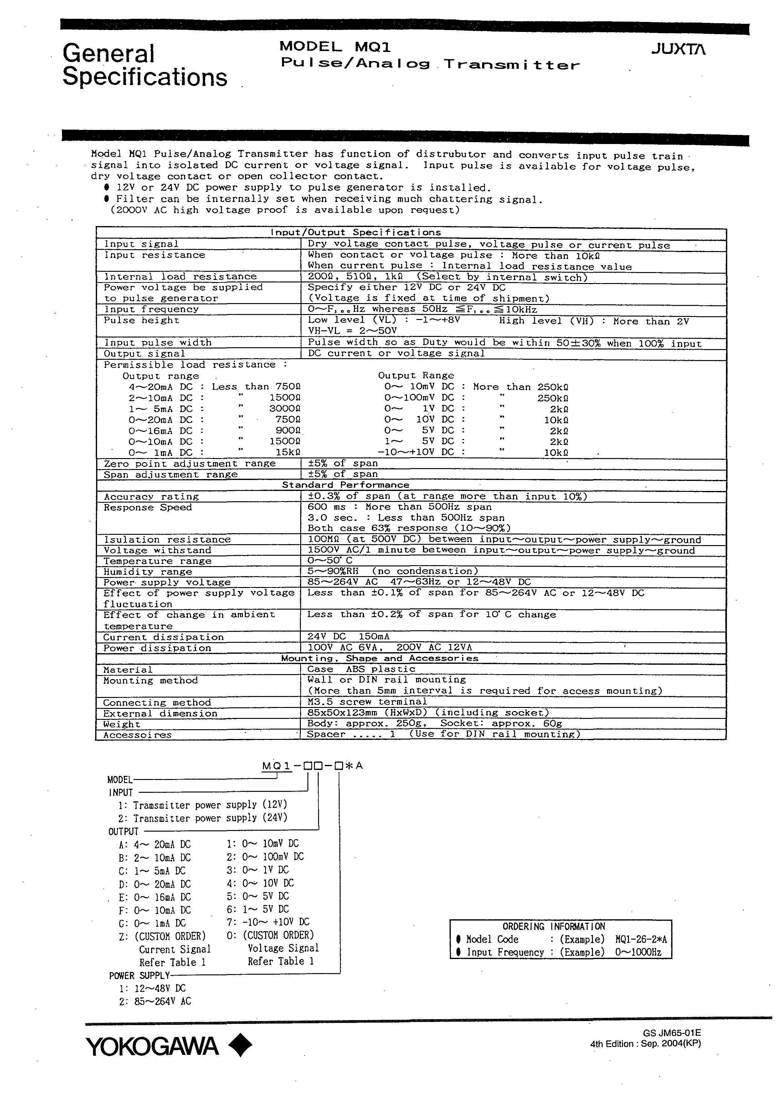 Model MQ1 Pulse/Analog Transmitter has function of distributor and converts input pulse train signal into isolated DC current or voltage signal. Input pulse is available for voltage pulse, dry voltage contact or open collector contact.