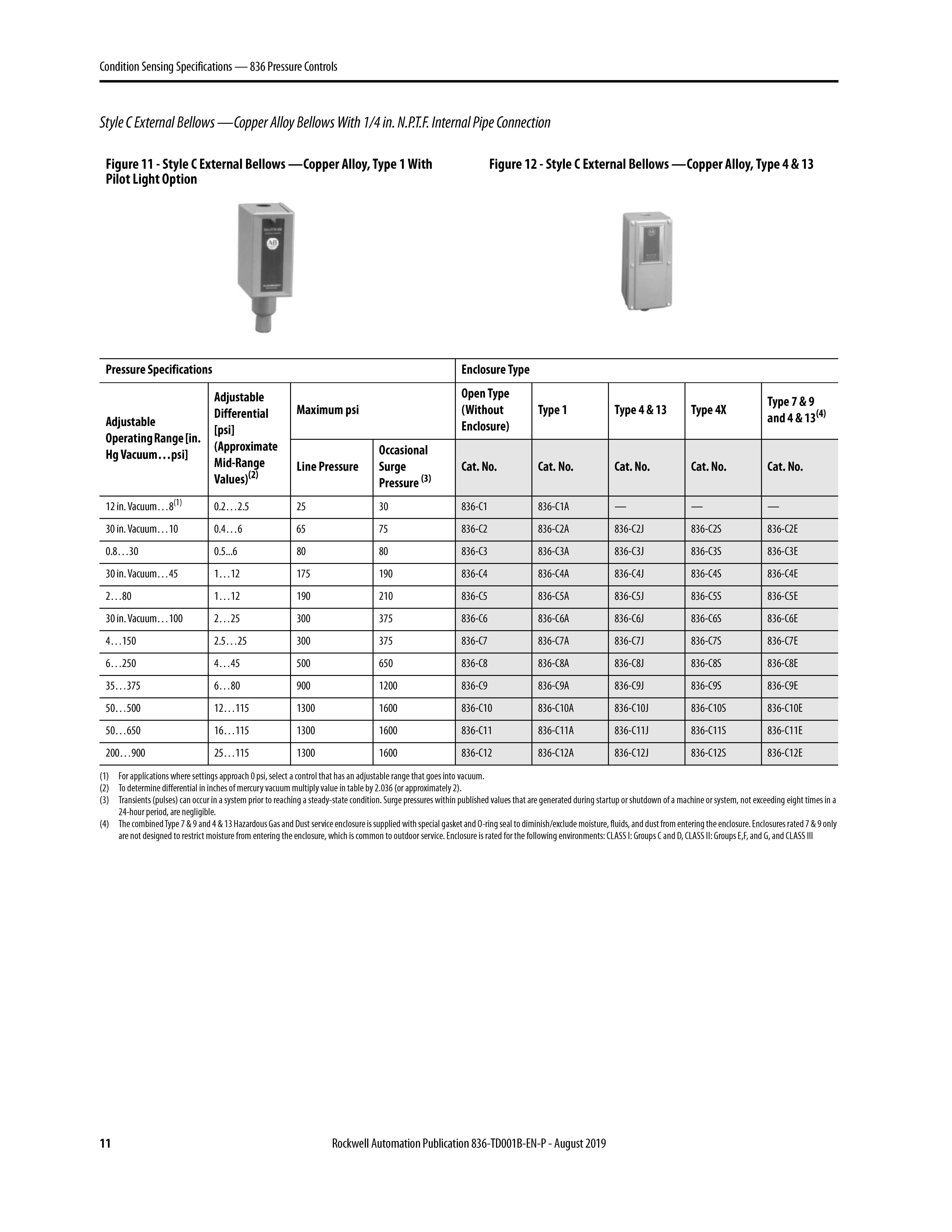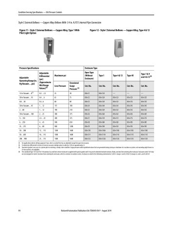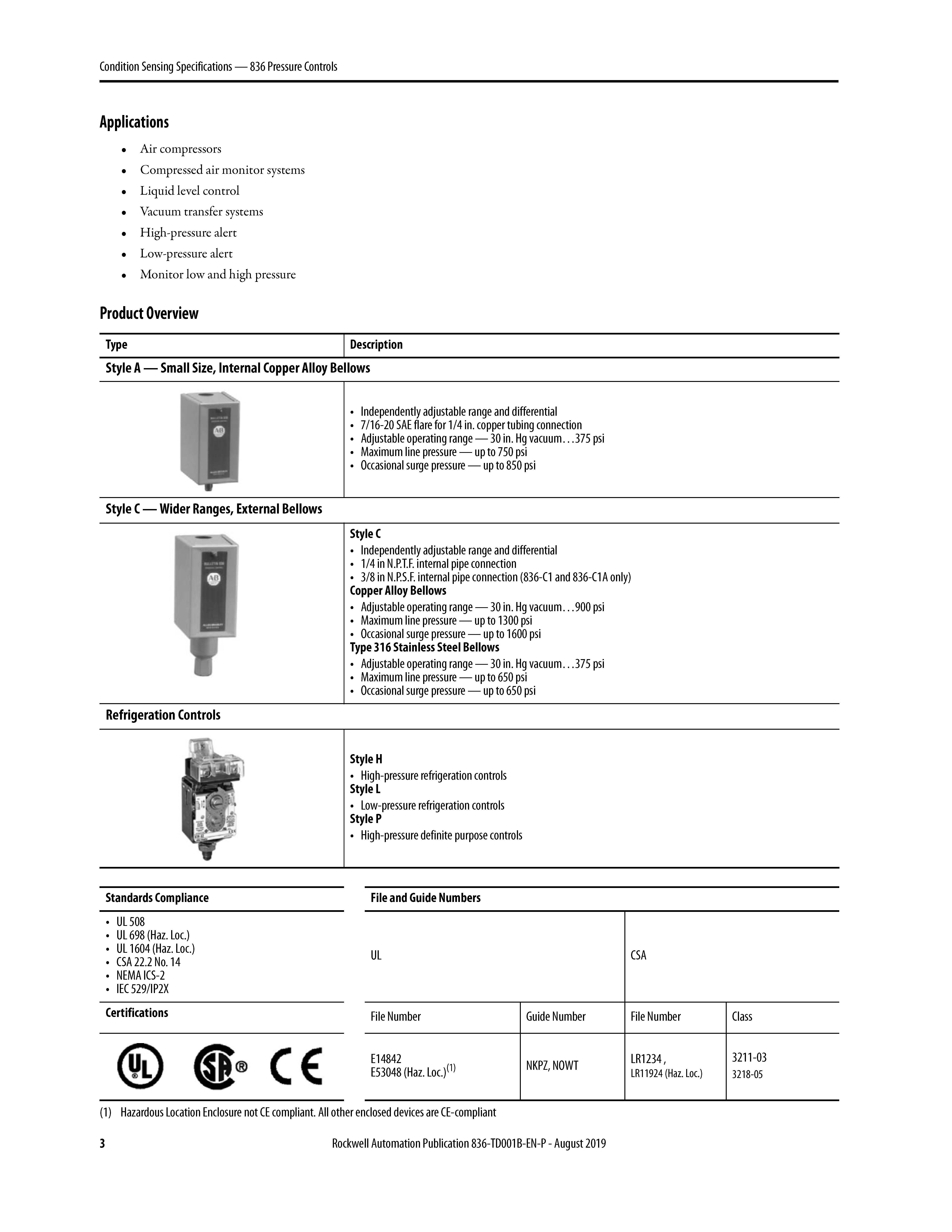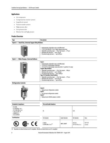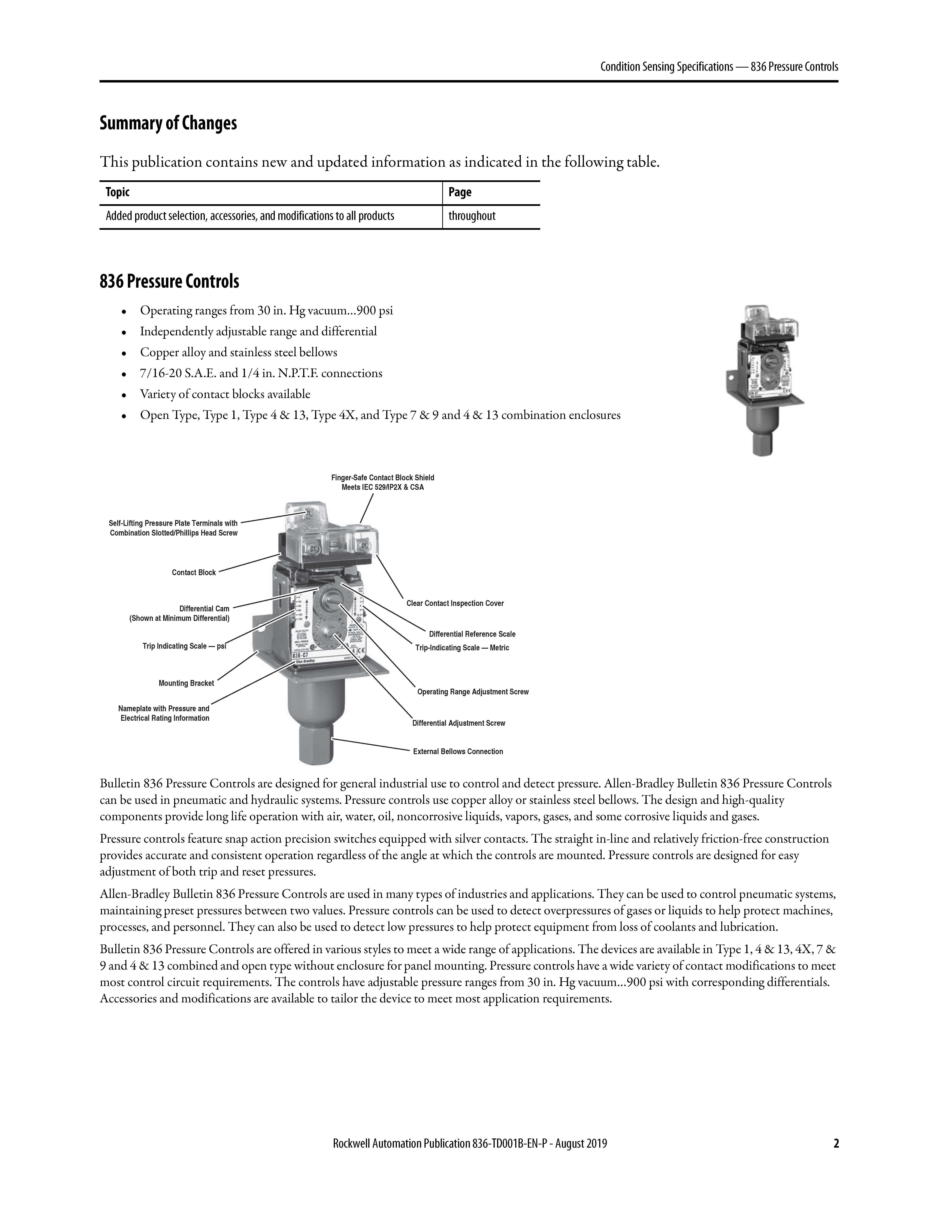 Bulletin 836 Pressure Controls are designed for general industrial use to control and detect pressure. Allen-Bradley Bulletin 836 Pressure Controls can be used in pneumatic and hydraulic systems. Pressure controls use copper alloy or stainless steel bellows. The design and high-quality components provide long life operation with air, water, oil, noncorrosive liquids, vapors, gases, and some corrosive liquids and gases.