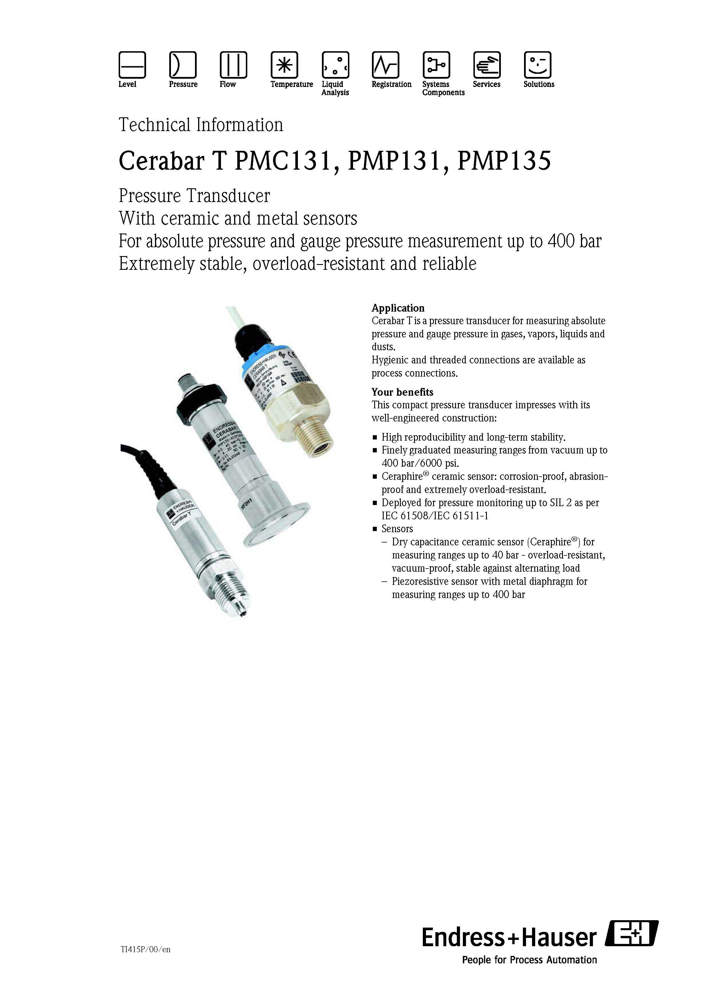Cerabar T is a pressure transducer for measuring absolute pressure and gauge pressure in gases, vapors, liquids and dusts. Hygienic and threaded connections are available as process connections.