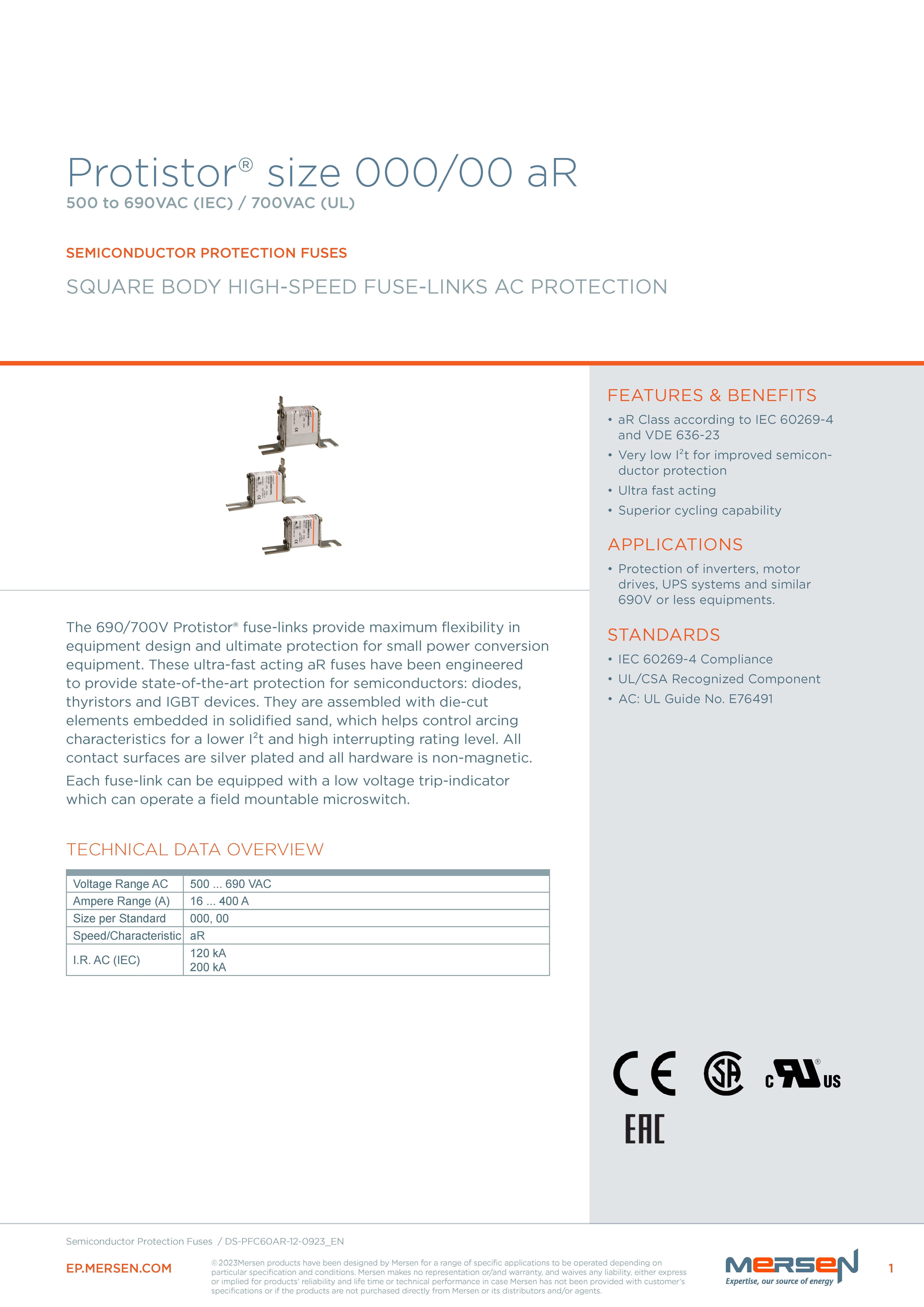 The 690/700V Protistor® fuse-links provide maximum flexibility in equipment design and ultimate protection for small power conversion equipment. These ultra-fast acting aR fuses have been engineered to provide state-of-the-art protection for semiconductors: diodes, thyristors and IGBT devices.