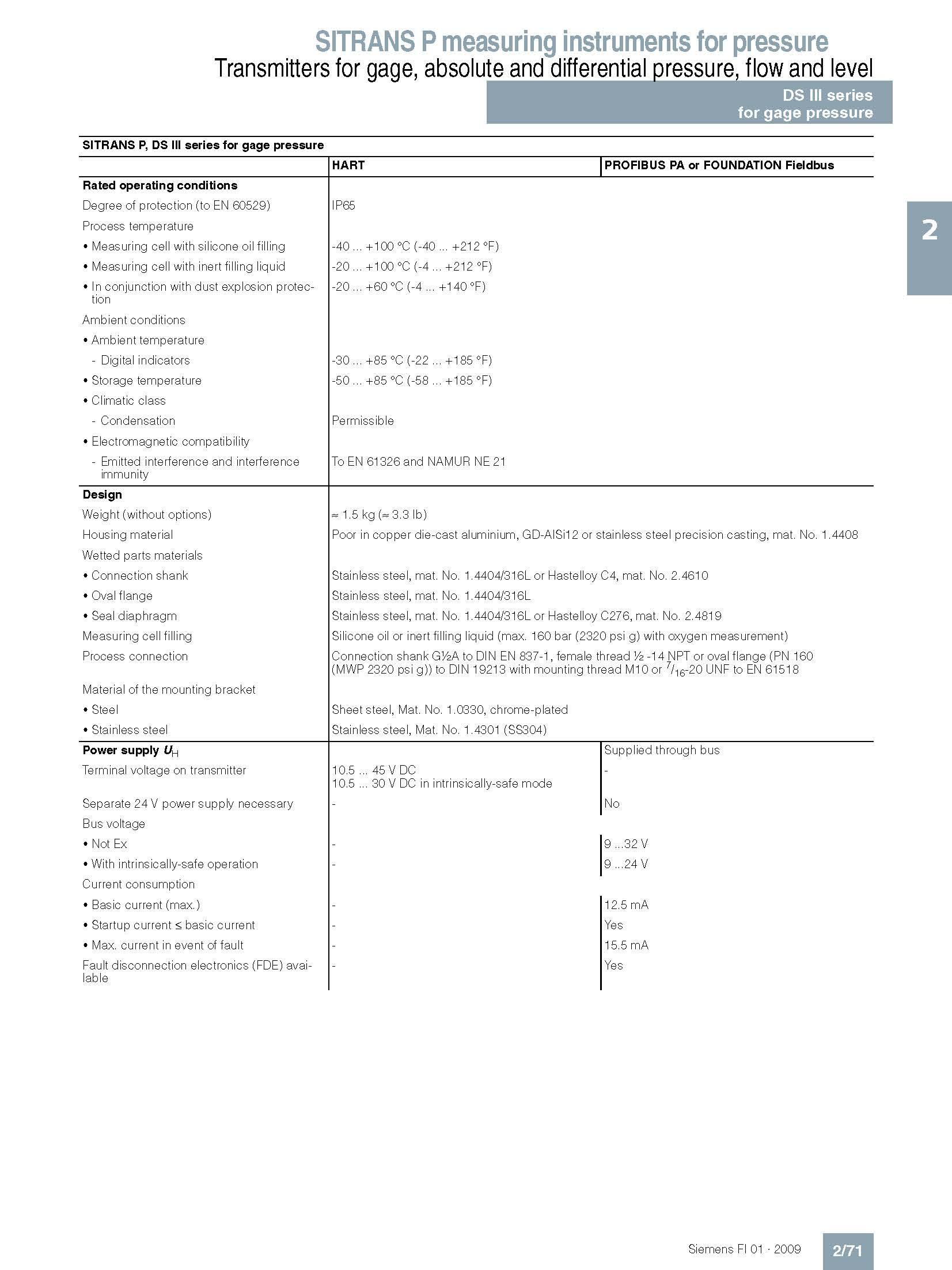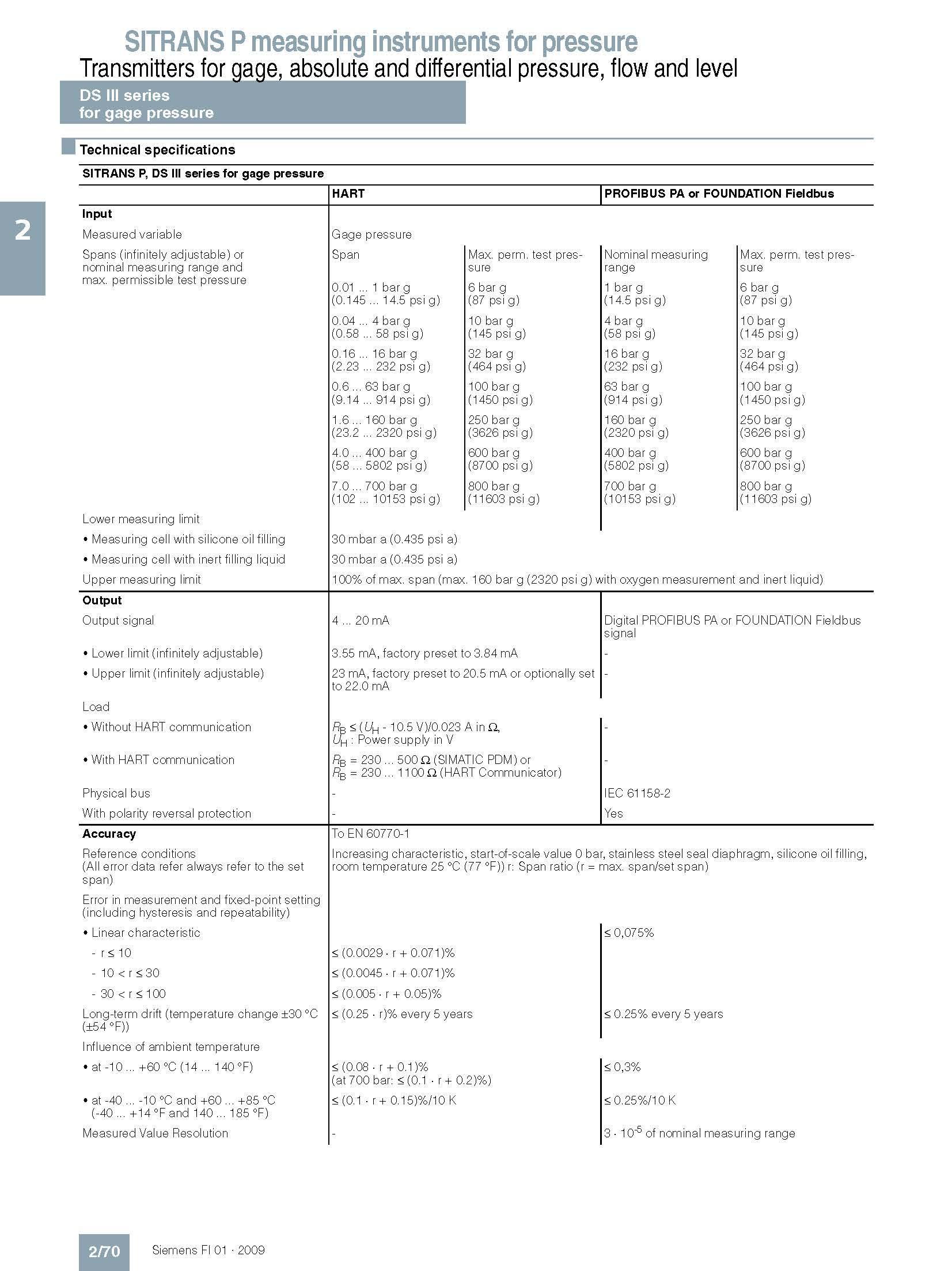 • Nominal measuring range from 1 to 400 bar for DS III PA (PROFIBUS PA) and FF (FOUNDATION Fieldbus)