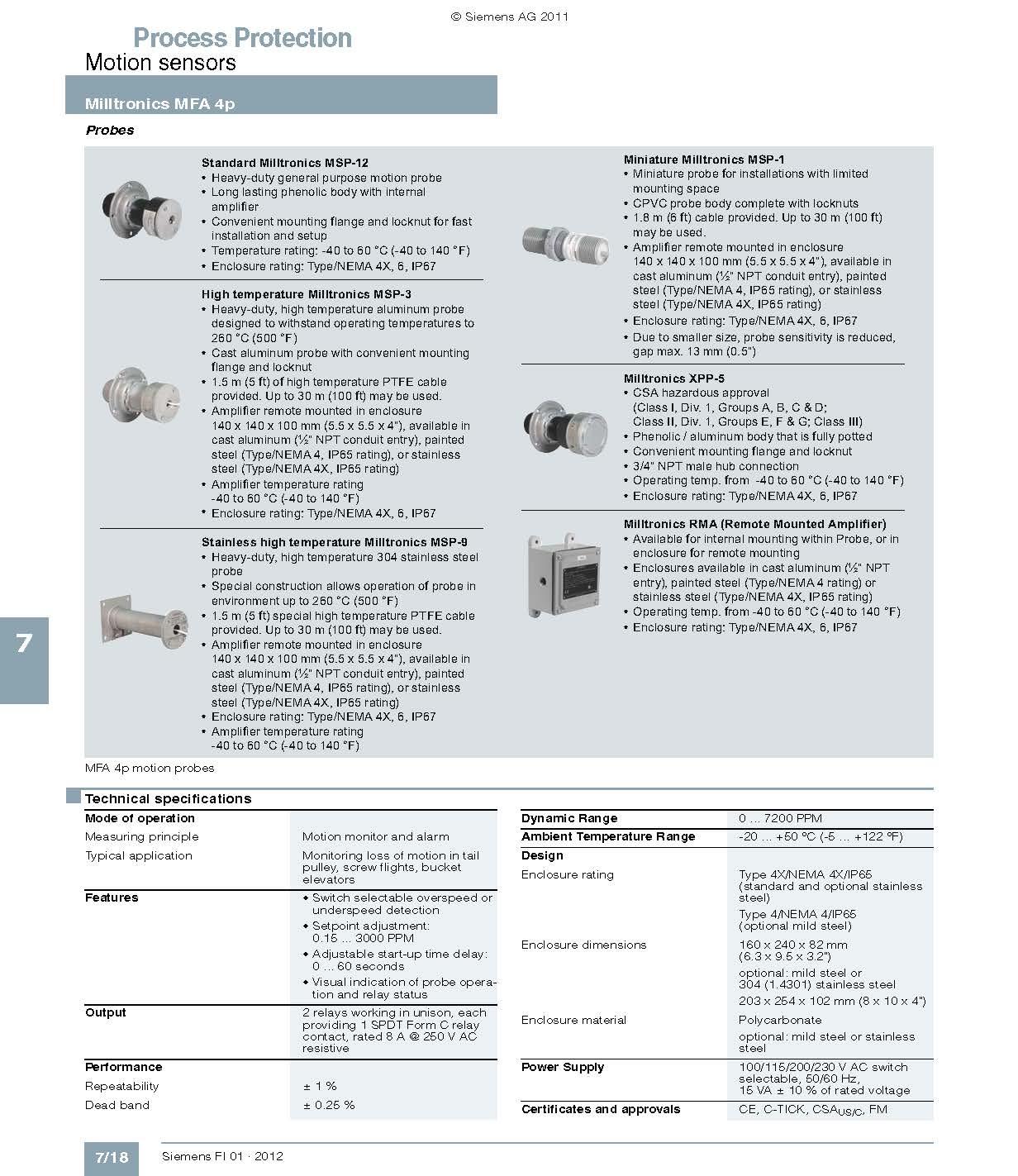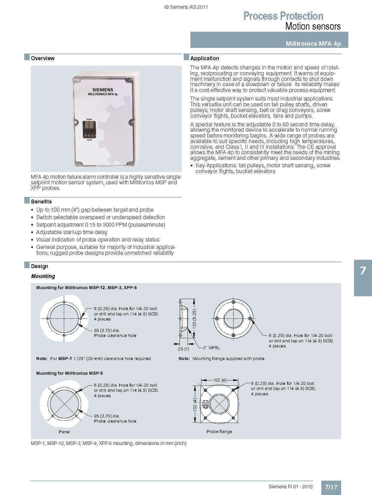 The MFA 4p detects changes in the motion and speed of rotating, reciprocating or conveying equipment. It warns of equipment malfunction and signals through contacts to shut down machinery in case of a slowdown or failure.