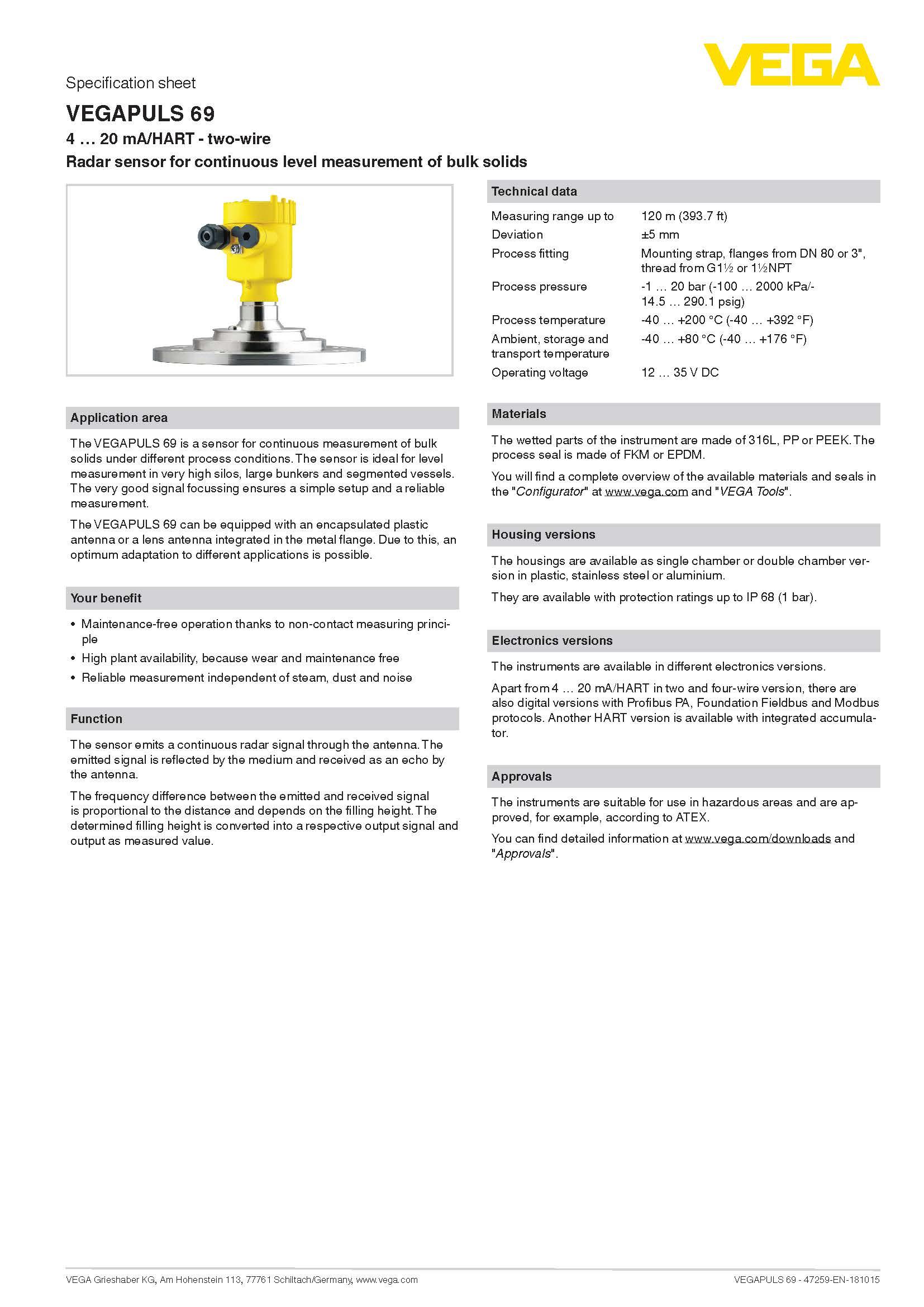 The VEGAPULS 69 is a sensor for continuous measurement of bulk solids under different process conditions. The sensor is ideal for level measurement in very high silos, large bunkers and segmented vessels.