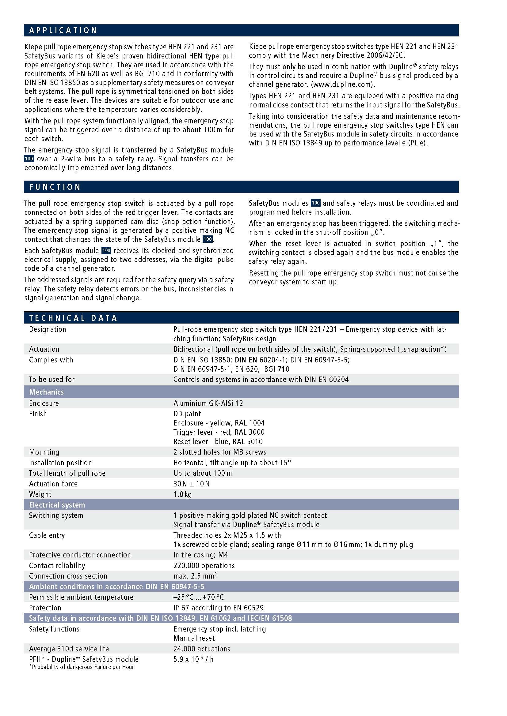The pull rope emergency stop switch is actuated by a pull rope connected on both sides of the red trigger lever. The contacts are actuated by a spring supported cam disc (snap action function). The safety relay detects errors on the bus, inconsistencies in signal generation and signal change.
